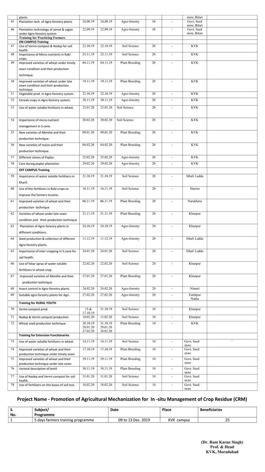 Training is one of the important roles of KVK. Training is a systematic effort to impart knowledge, improve skill, inculcate appropriate attitudes in farmers, rural youth and extension personnel in order to perform their duties effectively. KVK's trainings are conducted at various levels for which the programmes are designed based on the clientele problems and needs.